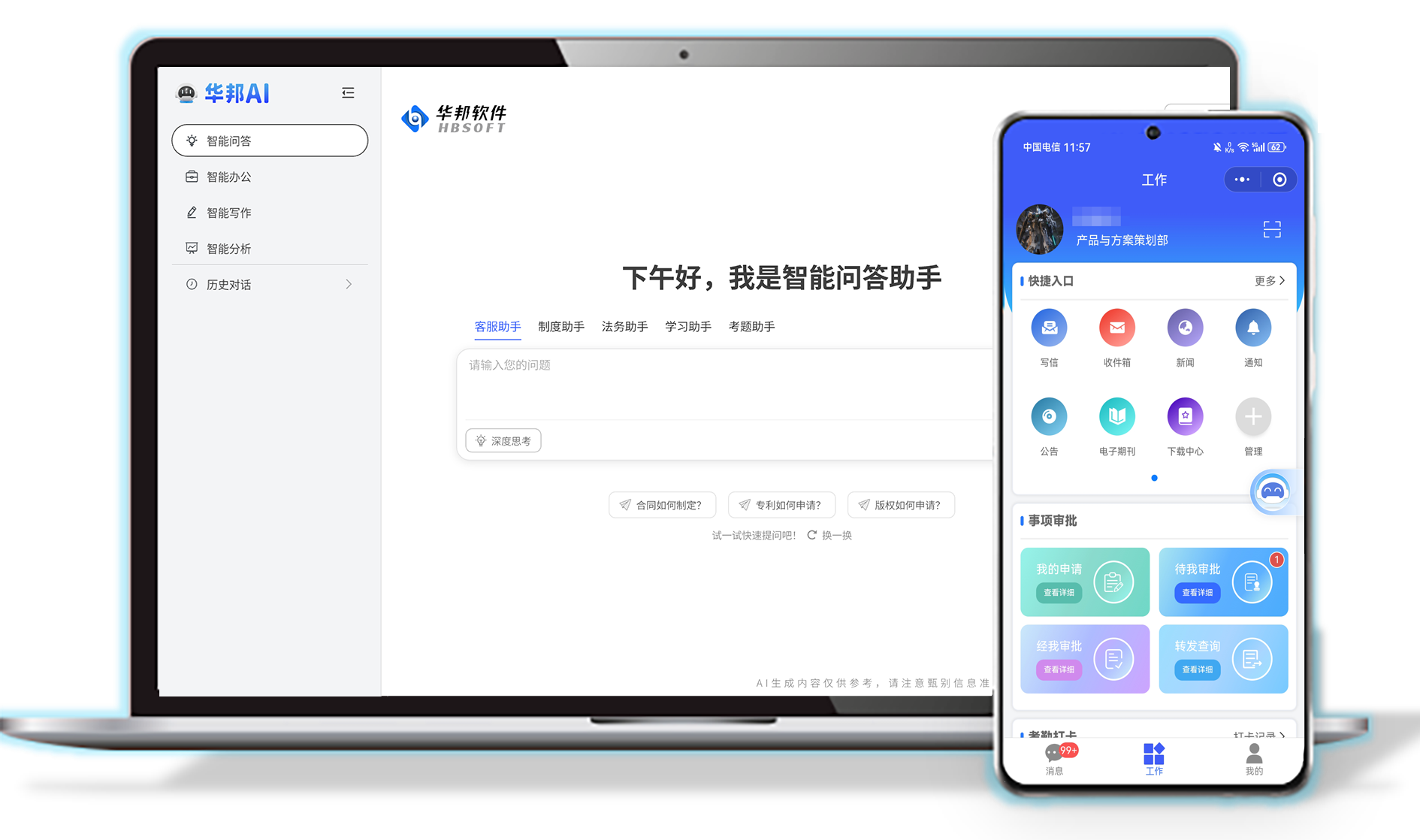 整合智慧公文、智能合同、智慧费控、资产问数、项目问数、HR助手的综合业务智能化管理方案。